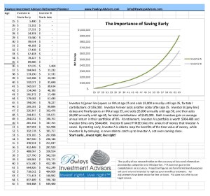 Consider two different investors starting to save for retirement at different ages. One starts saving early and stops at age 35 after having saved just $55,000. The second starts later, and saves $165,000 total. By the time retirement rolls around, the early bird has over $250,000 MORE in his portfolio, despite having only contributed $55,000. Yes, Virgina, time IS money. “invest right, live rightTM!”