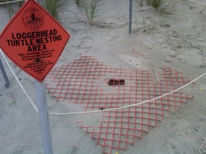 Here is their nest. The orange mesh protects the nest from predators. You can see the hole where they dug out of the sand the other night: